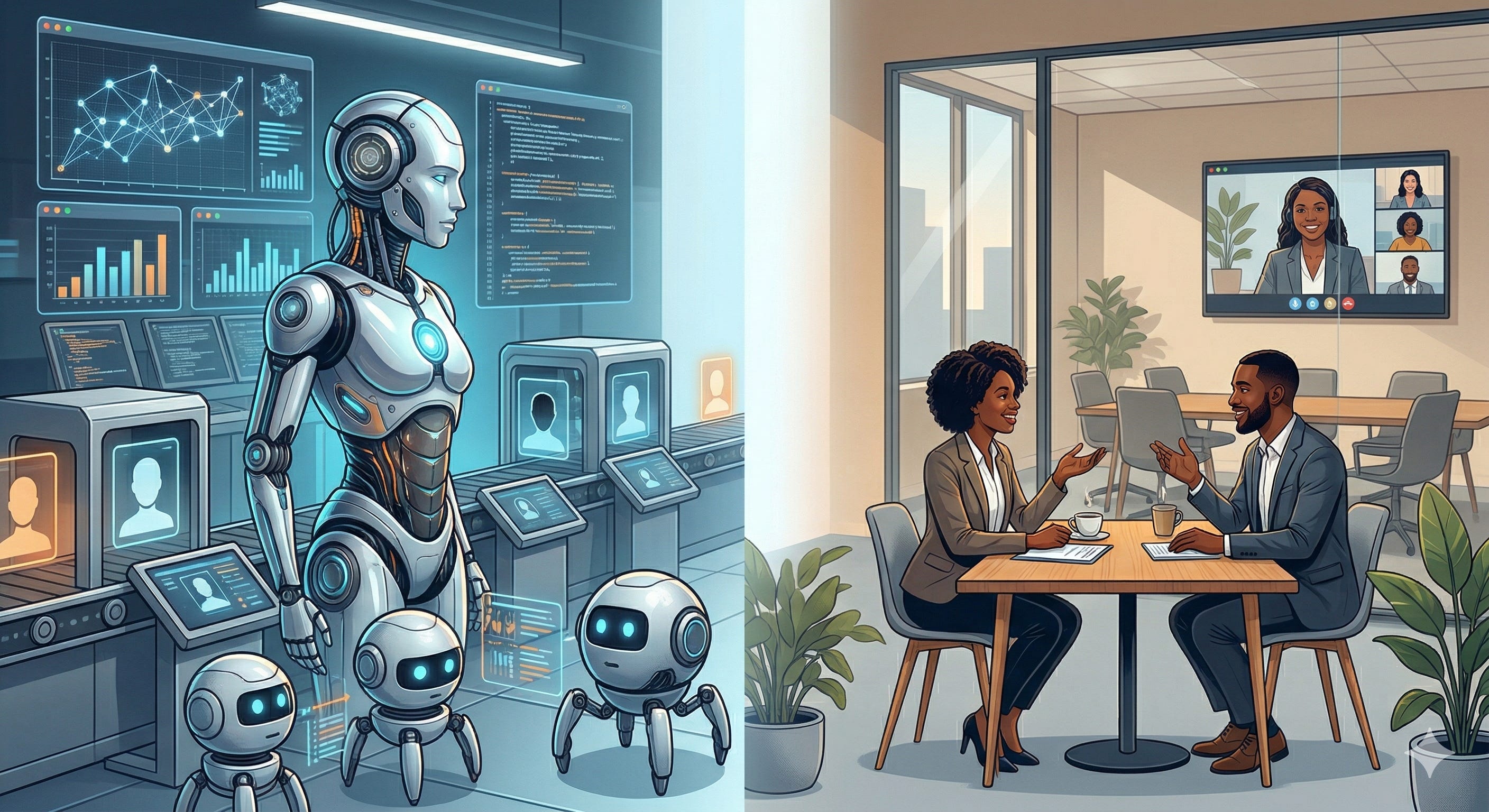 The more important question is how to design a recruiting model in which AI handles scale and process optimization, while human interaction is available and used where it creates the greatest value.