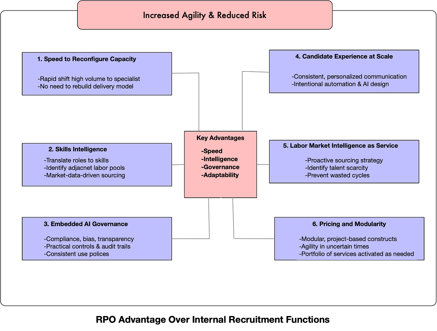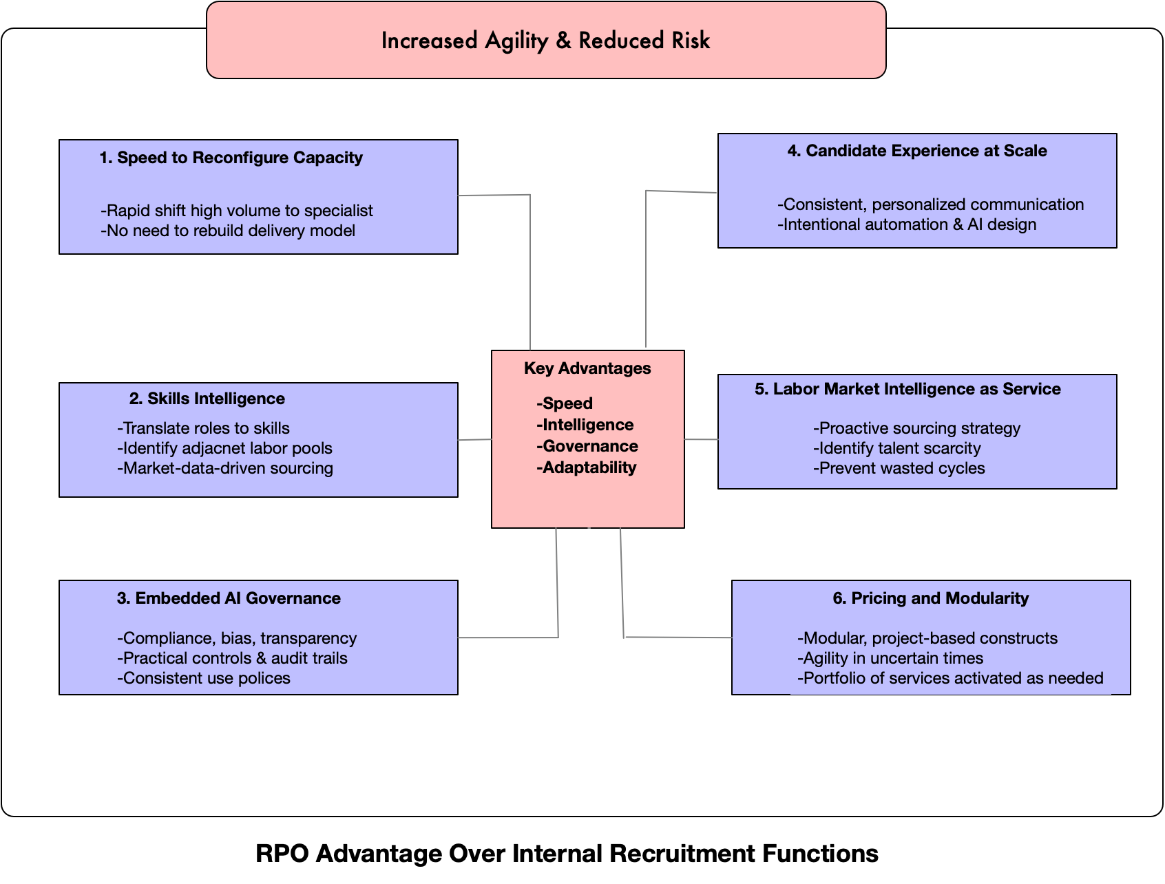 To thrive, RPO functions need to act as flexible, configurable operating systems for talent acquisition rather than as a staffing model. Its core asset is not recruiter headcount, but an integrated production architecture that combines automation, data, market intelligence, and specialized human expertise under a single model. Buyers are selecting a system that can handle volatility, provide insight, and maintain performance when demand shifts abruptly.