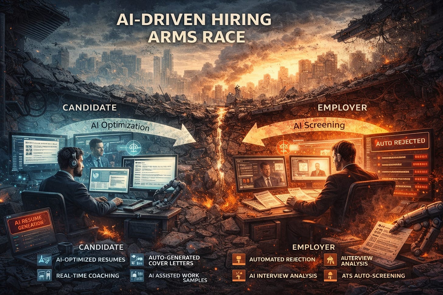 Candidates use AI to optimize applications. Employers deploy AI to detect or filter them. Candidates then refine their tools to evade those filters. Each cycle increases the game's sophistication while reducing the reliability of the signals produced.